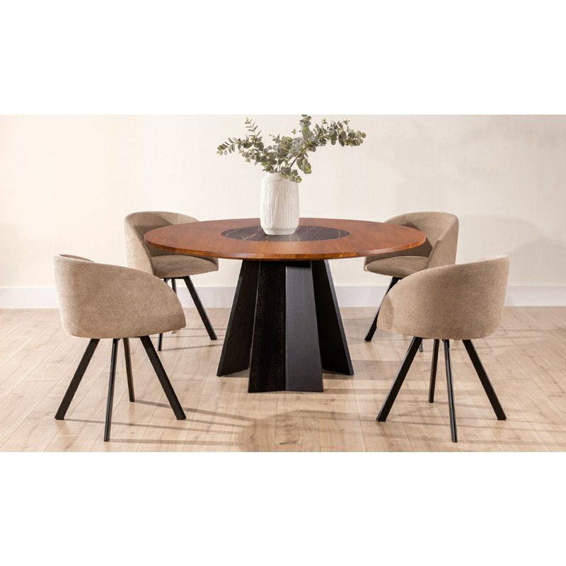 Dubový kulatý jídelní stůl Orio zaručeně upoutá pozornost v každém typu interiéru - závisí jen na zvolené barevné kombinaci nohou, desky a vnitřní otočné desky. Celkové provedení tohoto kulatého jídelního stolu, použité materiály jako dub a laminam (slinutá keramika) spolu s netradičním tvarem působí v interiéru skutečně exkluzivně.