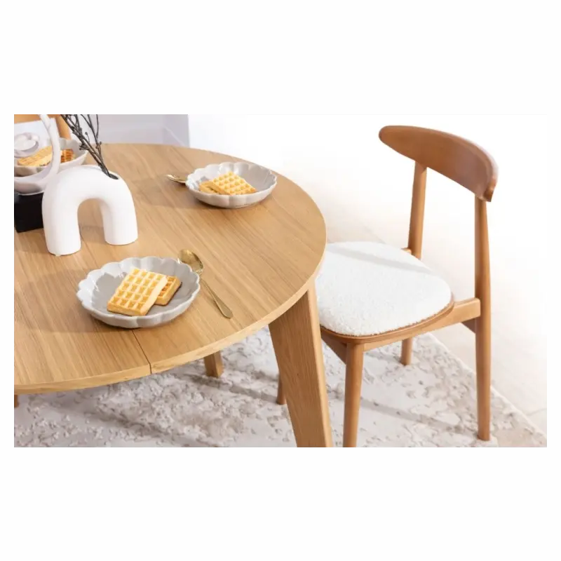 Kulatý rozkládací jídelní stůl Skandi (DÝHA/DUB) o průměru 95 cm umožňuje rozšíření užitné plochy o 2 přídavné desky šíře 50 cm. Z kulatého jídelního stolu se po rozložení stane oválný stůl o délce 195 cm. Deska kulatého jídelního stolu a přídavné desky jsou vyrobeny z kvalitní dubové dýhy, nohy z dubového masivu. Přídavné desky nemohou být schovány vevnitř stolu.