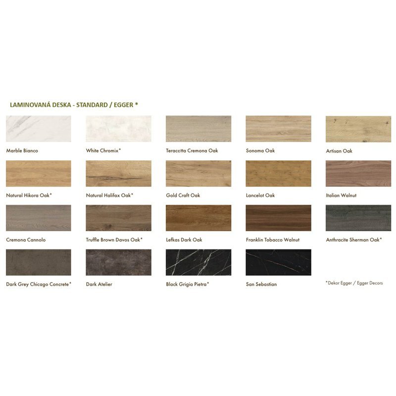 Horní deska je vyrobena z laminované dřevotřísky s odolným povrchem, který se snadno udržuje a dobře odolává běžnému opotřebení. Tloušťka desky je 18 mm, s možností elegantního černého hranění pro modernější vzhled. Nejste si jisti barvou? Rádi Vám zapůjčíme vzorník!